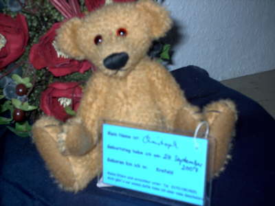 Ich bin der kleine Christoph, nur 18 cm groß, geboren am 24. September 2007. Hergestellt aus kurzem Stoppelkmohair mit echten Filzpfoten. Mit meinen braunen Kristallaugen schaue ich ganz neugierig in die Welt.Preis:69,00 Euro plus Versandkosten.
